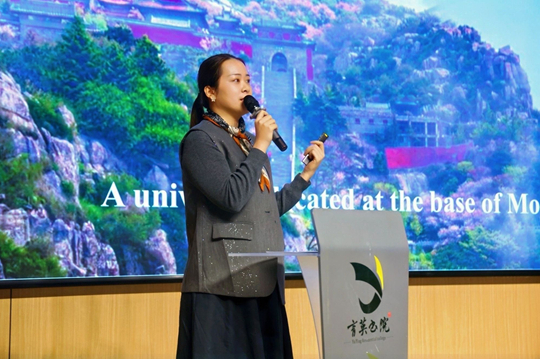 參觀學(xué)校游泳館、電影院、圖書(shū)館、工程實(shí)訓(xùn)中心、育英書(shū)院后,泰山科技學(xué)院為全體學(xué)員舉辦見(jiàn)面歡迎會(huì)。泰山科技學(xué)院常務(wù)副校長(zhǎng)謝承紅致歡迎辭,他引用孔子“有朋自遠(yuǎn)方來(lái),不亦樂(lè)乎?”表達(dá)對(duì)來(lái)賓的歡迎,并介紹了學(xué)校結(jié)合泰山文化及新教育理念所做的育人探索,祝愿大家在泰科度過(guò)美好時(shí)光。蓬萊科幻學(xué)院副院長(zhǎng)宋亞潔以全英文方式,介紹學(xué)校發(fā)展歷程、育人理念、辦學(xué)特色、校園文化、辦學(xué)成果和發(fā)展愿景,她還特別呈現(xiàn)了學(xué)校在國(guó)際化辦學(xué)實(shí)踐中的探索,介紹了學(xué)校留學(xué)生來(lái)校學(xué)習(xí)的政策,歡迎21個(gè)“一帶一路”共建國(guó)家及世界各國(guó)的學(xué)生、友人到泰山科技學(xué)院留學(xué)、訪學(xué)。
