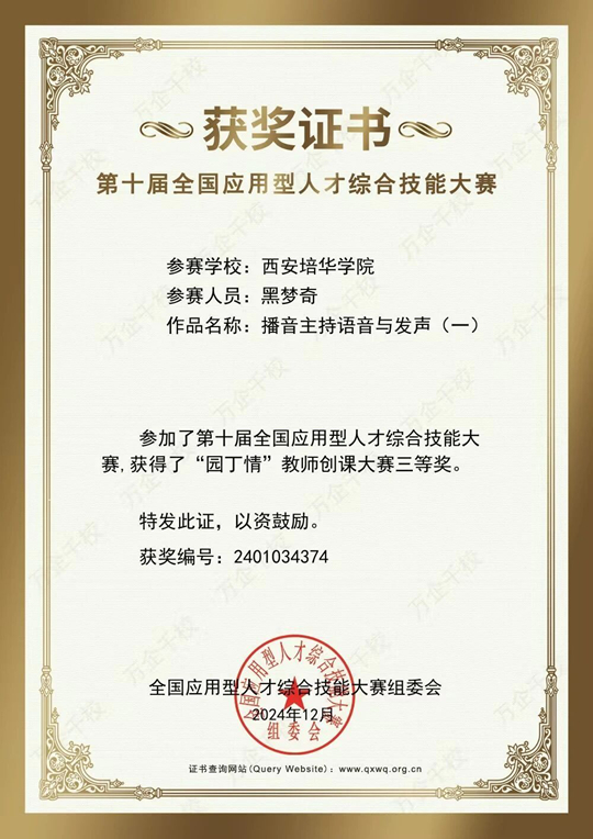 黑夢奇老師受邀參與央視紀(jì)錄片配音并非偶然。作為陜西省朗誦協(xié)會理事、西安培華學(xué)院大學(xué)生朗誦藝術(shù)團(tuán)指導(dǎo)教師,她曾獲第五、六、七屆中華經(jīng)典誦讀大賽陜西省賽區(qū)一等獎,并榮獲第七屆中華經(jīng)典誦寫講大賽全國一等獎。