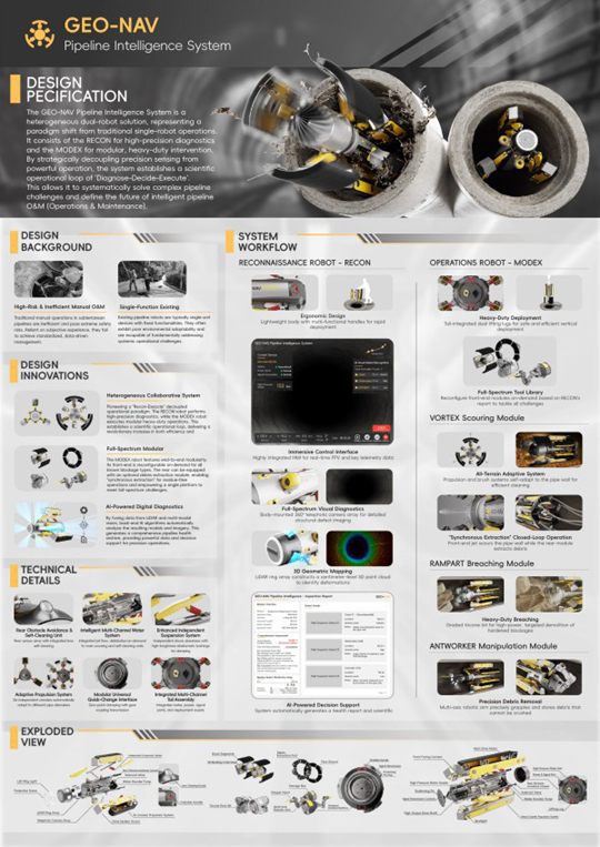 此次獲獎(jiǎng)作品由工業(yè)設(shè)計(jì)教研室馮穎老師指導(dǎo),學(xué)生林榮鑫創(chuàng)作,《“經(jīng)緯”管道智能運(yùn)維雙體系統(tǒng)》(GEO-NAV Pipeline Intelligence System)是一項(xiàng)針對(duì)城市地下基礎(chǔ)設(shè)施維護(hù)難題的創(chuàng)新解決方案。針對(duì)傳統(tǒng)管道運(yùn)維中存在的“人工高風(fēng)險(xiǎn)、單一機(jī)器人功能受限”等痛點(diǎn),林榮鑫提出了一種“異構(gòu)雙體協(xié)同”的作業(yè)模式——系統(tǒng)由負(fù)責(zé)高精度勘察診斷的“經(jīng)”(RECON)機(jī)器人與負(fù)責(zé)重型修復(fù)作業(yè)的“緯”(MODEX)機(jī)器人組成。