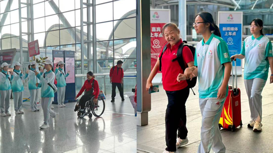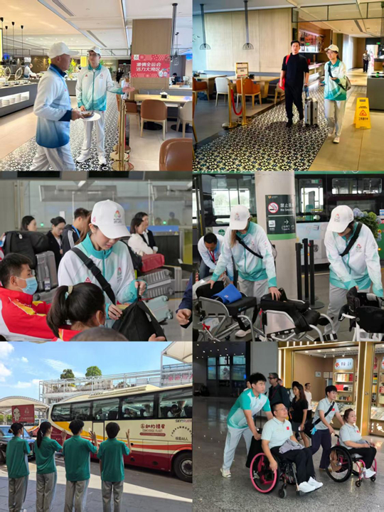 “小海豚”志愿者遵循“平等、尊重、適度、暖心、精準(zhǔn)、高效”原則,以伙伴、朋友的身份提供服務(wù),注重殘障人士的自主性與獨(dú)立性,營(yíng)造暖心服務(wù)氛圍。在白云機(jī)場(chǎng)T1、T2、T3航站樓接機(jī)口,“小海豚”志愿者會(huì)提前核對(duì)殘障運(yùn)動(dòng)員的航班信息,推著可折疊的無(wú)障礙行李車等候,為坐輪椅的運(yùn)動(dòng)員搬運(yùn)行李并平穩(wěn)護(hù)送其通過(guò)特殊通道;遇到視力障礙的運(yùn)動(dòng)員,志愿者會(huì)輕握對(duì)方的手腕引導(dǎo)其避開(kāi)人群,還會(huì)提前告知前方路況。從最初志愿者問(wèn)運(yùn)動(dòng)員“您好,需要幫忙嗎?”到運(yùn)動(dòng)員遇到問(wèn)題主動(dòng)問(wèn)“志愿者,我的同伴需要去T1,能帶他去T1嗎?”這不僅僅是對(duì)志愿者服務(wù)的認(rèn)可,更是一份信任。