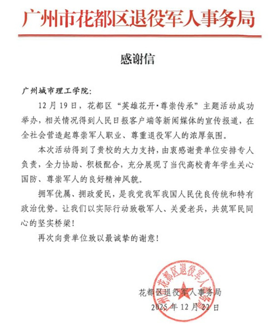 12月22日,廣州城市理工學(xué)院收到一封來(lái)自廣州市花都區(qū)退役軍人事務(wù)局的感謝信。信中對(duì)學(xué)校在12月19日“英雄花開(kāi)·尊崇傳承”雙擁主題活動(dòng)中給予的大力支持致以誠(chéng)摯謝意。這份滿載認(rèn)可的感謝信,既是對(duì)全校師生積極參與雙擁工作的高度贊譽(yù),更是對(duì)學(xué)校深耕國(guó)防教育、厚植家國(guó)情懷育人成效的充分肯定。