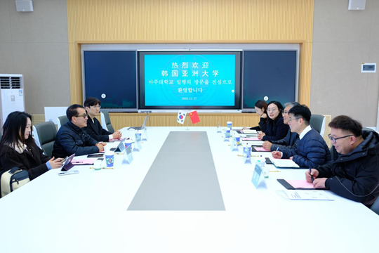 為深化中韓教育交流,共育具有國(guó)際視野的高素質(zhì)人才,2025年11月27日,韓國(guó)亞洲大學(xué)國(guó)際協(xié)力副校長(zhǎng)李碩遠(yuǎn)、國(guó)際處入學(xué)部部長(zhǎng)金昌顯、國(guó)際處入學(xué)部主任李宣慧一行到訪泰山科技學(xué)院。泰山科技學(xué)院副校長(zhǎng)智英斌及相關(guān)部門(mén)負(fù)責(zé)人熱情接待了來(lái)訪嘉賓,雙方圍繞意向合作項(xiàng)目展開(kāi)深度洽談,達(dá)成多項(xiàng)共識(shí)。