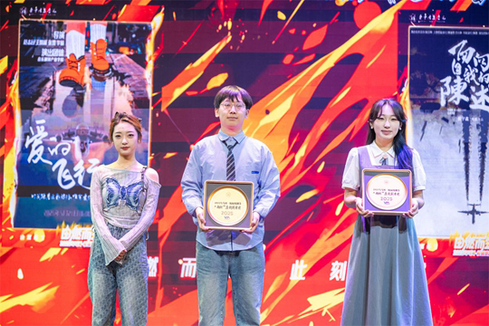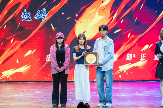 2024烏馬河校園戲劇節(jié)“優(yōu)秀男配角”獲得者梁越為獲得“超燃”戲劇突破獎的演員話劇《面向自我的陳述》張芏、舞劇《琵琶行》王誠頒獎。