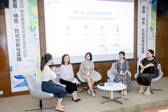 上半場(chǎng)與會(huì)嘉賓圍繞“低生育時(shí)代的教育突圍:幼兒園如何在托幼一體化中實(shí)現(xiàn)服務(wù)轉(zhuǎn)型”展開了深入討論。西安市第一保育院的王淑君園長、深圳新生幼兒園的韋小冰園長、陜西師范大學(xué)實(shí)驗(yàn)幼兒園的李敏園長以及西安歐亞人文教育學(xué)院陳陽院長分別從政策準(zhǔn)備、課程體系構(gòu)建、師資培養(yǎng)等角度分享了各自的觀點(diǎn)和實(shí)踐經(jīng)驗(yàn)。
