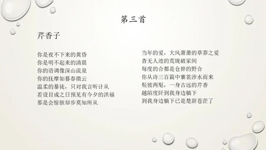 《芹香子》是一首商籟體的情詩,但既不是莎士比亞式的商籟格式(4+4+4=2),也不同于佩脫拉克式的商籟格式(8+6),而是以前后各七行(7+7)的對照形成獨特的韻律。童明認(rèn)為,木心的十四行詩,雖然不嚴(yán)格押韻,卻注重內(nèi)在的節(jié)奏律動。詩中“我”大概是女性。對比《詩經(jīng)》中“淑女”和“子都”(美男子)之間的情話,木心的“芹香子”是個新的稱謂,取其樸實和清新。