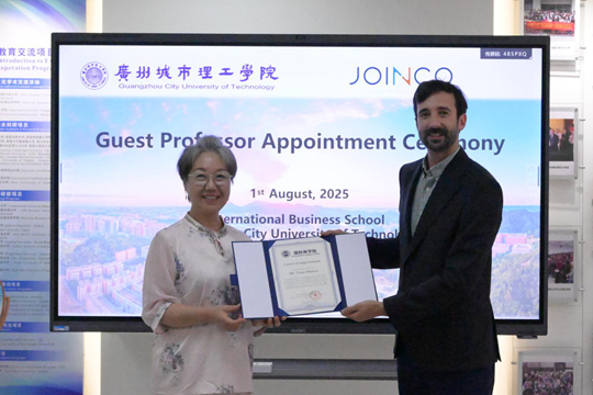 在會談結(jié)束前的聘任儀式上,安然代表學(xué)院向Tiago Mateus頒發(fā)客座教授聘書。安然表示:“Tiago先生是葡萄牙注冊商貿(mào)律師,在國際經(jīng)貿(mào)和法律領(lǐng)域造詣深厚,致力于推動中歐經(jīng)貿(mào)合作與產(chǎn)教融合發(fā)展。今年四月,他受邀參加廣交會調(diào)研座談會并發(fā)言,向國家及省市相關(guān)領(lǐng)導(dǎo)匯報了與廣州城市理工學(xué)院協(xié)同培養(yǎng)國際商科人才的創(chuàng)新模式與實踐成果。他的加入必將為學(xué)校應(yīng)用型人才培養(yǎng)注入新動能!盩iago Mateus對此表示感謝,并強調(diào):“Joinco將持續(xù)踐行企業(yè)社會責(zé)任,加強校企協(xié)同創(chuàng)新,將企業(yè)最新實踐案例引入課堂,助力廣城理培育具有全球勝任力的應(yīng)用型人才!