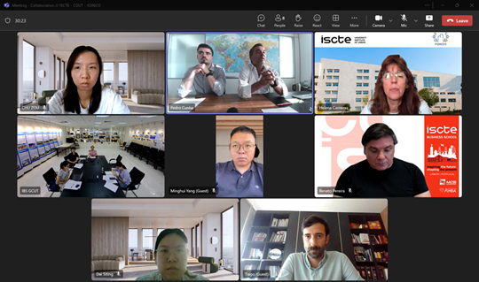 就在來訪前兩天(7月30日),Joinco公司促成了廣州城市理工學(xué)院與葡萄牙里斯本大學(xué)學(xué)院(ISCTE)的三方線上會議。此次來訪正是Joinco公司對該會議的快速響應(yīng)和具體落實。該線上會議由Joinco公司CEO Pedro Cunha主持,ISCTE副校長Helena Carreiras(前葡萄牙國防部部長)、商學(xué)院副院長Renato Pereira,以及廣州城市理工學(xué)院國際商學(xué)院院長安然、專業(yè)帶頭人和承擔(dān)國際商務(wù)談判課程的青年教師共同參與。三方重點圍繞國際交換生項目、學(xué)生實習(xí)實踐、產(chǎn)學(xué)研深度融合等議題展開深入討論,并就建立常態(tài)化合作機制達成初步共識。值得一提的是,國際商學(xué)院楊明暉教授作為ISCTE的優(yōu)秀校友,在合作中發(fā)揮重要的橋梁紐帶作用。