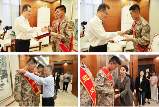 隨后,黨委書記劉鋒、副書記姚文靜為兩位校友佩戴“歡迎返!本R帶,姜波理事長為他們頒發(fā)“杰出校友”榮譽證書,表彰他們在閱兵中的非凡風(fēng)采以及為校爭光的突出表現(xiàn)。