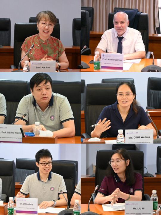 在教師交流環(huán)節(jié),計(jì)算機(jī)工程學(xué)院/大數(shù)據(jù)學(xué)院、電子信息工程學(xué)院/通信工程學(xué)院、汽車與交通工程學(xué)院教師分別與Martin Gairing教授就專業(yè)共建、教師訪學(xué)、教師在職讀博、學(xué)生讀研等議題進(jìn)行深入交流。其中,計(jì)算機(jī)工程學(xué)院院長(zhǎng)助理鄧一星了解利物浦大學(xué)對(duì)所有在讀碩士研究生都保證實(shí)習(xí)機(jī)會(huì)后表示,這將極大提高學(xué)生的就業(yè)競(jìng)爭(zhēng)力。計(jì)算機(jī)工程學(xué)院李昊棟博士則希望廣州城市理工學(xué)院教師可有機(jī)會(huì)赴利物浦大學(xué)短期訪學(xué)或在職讀博。電子信息工程學(xué)院劉洣表示,利物浦大學(xué)開(kāi)設(shè)多個(gè)與電子信息、人工智能相關(guān)的碩士專業(yè),且對(duì)學(xué)生的本科專業(yè)背景不設(shè)要求,因此學(xué)院將大力鼓勵(lì)學(xué)生赴利物浦大學(xué)攻讀研究生。汽車與交通工程學(xué)院交通工程教研室副主任丁偉華則對(duì)兩校在軌道設(shè)計(jì)、人臉識(shí)別、車輛問(wèn)題預(yù)測(cè)等方面開(kāi)展“人工智能+課程”專業(yè)共建提出了設(shè)想。此外,Martin Gairing教授還提出,利物浦大學(xué)正在推進(jìn)“3.5+0.5+1”的升研模式,將學(xué)生的語(yǔ)言銜接課程前移,且不設(shè)入學(xué)語(yǔ)言要求,這將有效縮短廣州城市理工學(xué)院學(xué)生赴利物浦大學(xué)讀研的時(shí)間,提高直升研究生項(xiàng)目對(duì)廣州城市理工學(xué)院學(xué)生的吸引力。