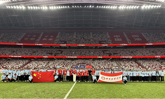 由培華志愿者精心布置的“紅色海洋”成為賽場又一亮點。賽前,志愿者們分組將紅色助威服整齊擺放在6萬座席上;比賽間隙,引導觀眾穿戴助威服,帶動全場形成紅色視覺矩陣,與賽場內(nèi)的國旗和加油標語相呼應(yīng),成為央視轉(zhuǎn)播畫面中的經(jīng)典場景。