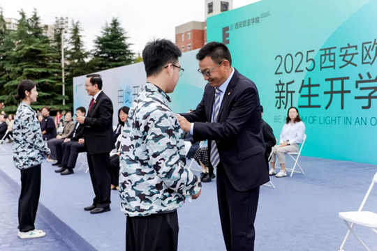 西安歐亞學(xué)院創(chuàng)辦人、董事長(zhǎng)胡建波教授,西安歐亞學(xué)院黨委書記趙國華教授共同為新生佩戴;,頒發(fā)30周年限定版學(xué)生證。