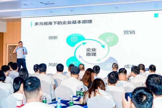 換屆大會上,胡建波為校友們帶來《企業(yè)基本原理》的主題分享。他從德魯克的管理理論講到科斯的交易成本理論、熊彼得的創(chuàng)新理論,再結(jié)合華為、小米等企業(yè)案例以及歐亞的教育實踐樣本,深入淺出地講解了“營銷、成本、風(fēng)險、創(chuàng)新”這四大企業(yè)基本原理。