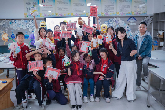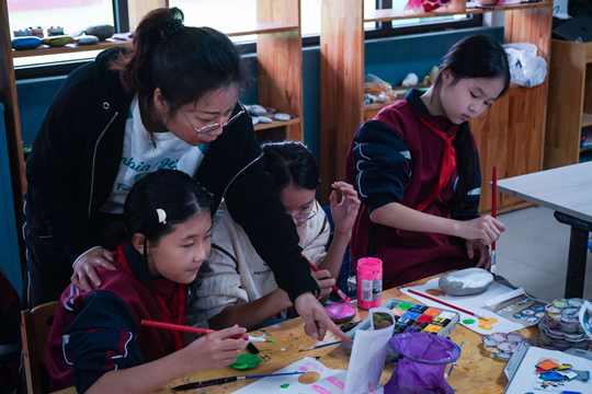 9月22日,在牛家灣小學教育環(huán)境設計與改造項目完滿竣工之際,項目師生團隊為孩子們準備了美術(shù)文具禮物,公益藝術(shù)課“石頭上的藝術(shù)魔法”也隨即開展。該課程由耿暖暖、徐娜及行業(yè)教師張偉共同指導,參與環(huán)境設計與改造項目的實習學生輔助教學,將校園環(huán)境中的“石文化”主題延伸至動態(tài)課堂,有效激發(fā)了學生的藝術(shù)興趣與創(chuàng)造力,實現(xiàn)了美育對童心的深層浸潤。