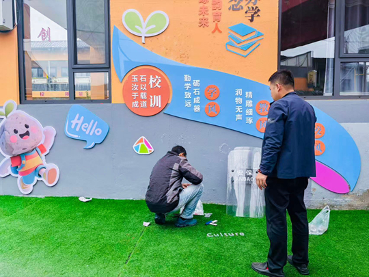 8月初,由西安歐亞學院艾德藝術(shù)設計學院耿暖暖、陳斐、劉玥頔、劉晨四位教師組成的專家組赴牛家灣小學進行實地踏勘與精準測量。之后,由耿暖暖、張偉及大四實習學生團隊共同完成了融合“石文化”理念的校園環(huán)境設計與改造方案。9月,改造工程全面落地,校園教學樓外立面及樓道空間煥然一新,實現(xiàn)了從物理空間到文化育人陣地的深刻轉(zhuǎn)變。