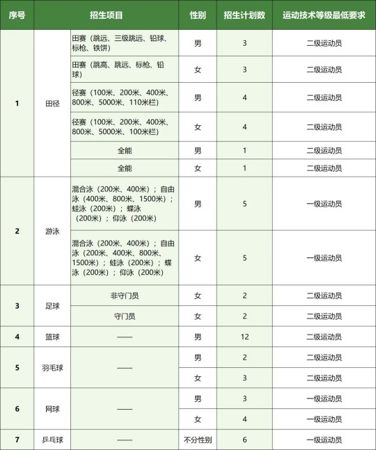 第十條 招生計(jì)劃總數(shù) 我校招生項(xiàng)目包括:籃球、足球、田徑(田賽、徑賽、全能)、羽毛球、網(wǎng)球、乒乓球、游泳。招生計(jì)劃總數(shù)為60名,按照上級(jí)部門規(guī)定,各項(xiàng)目最終招生人數(shù)視我校生源實(shí)際情況和項(xiàng)目需求而定。各項(xiàng)目具體要求如下: