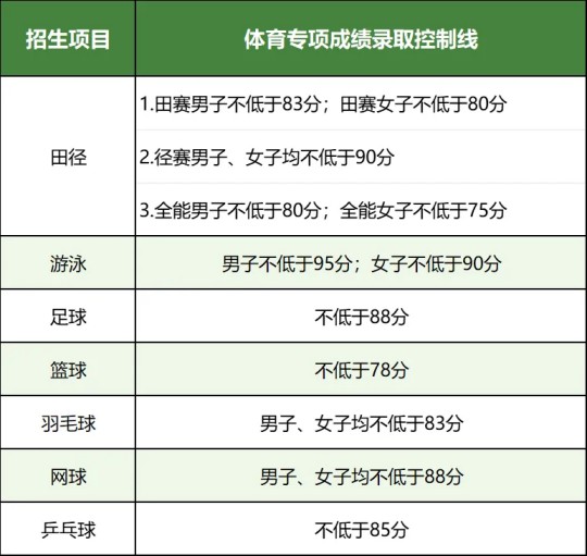 注:以上各項(xiàng)目體育專項(xiàng)成績(jī)錄取控制線均包含所述分?jǐn)?shù)。