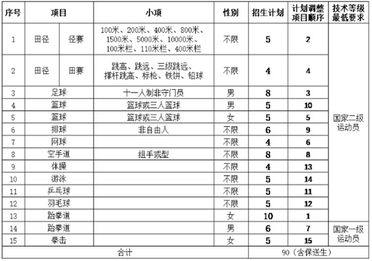 3.在調(diào)整計劃過程中,若某項目生源不滿足第1條原則,該項目不再增加計劃;若所有項目生源均不滿足第1條原則,本年度我校運動訓(xùn)練專業(yè)招生錄取結(jié)束。
