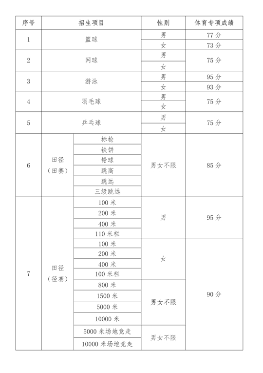 考生思想政治品德考察與體檢合格,在達到我校文化成績和體育專項成績錄取控制線的基礎上,根據(jù)考生的文化成績(折合百分制后)和體育專項成績3:7的比例進行綜合評價,計算考生錄取綜合分。具體公式為:綜合分=(文化成績/6)×30%+體育專項成績×70%。綜合分計算時保留小數(shù)點后兩位,采用四舍五入計數(shù)保留法。