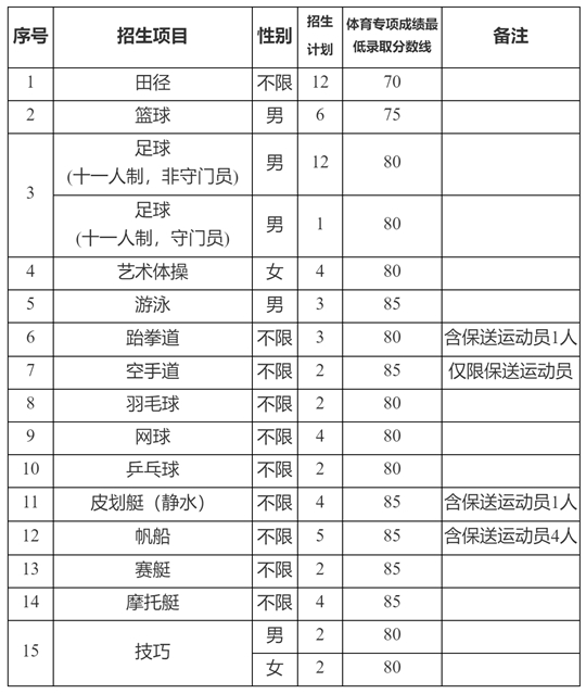 6. 保送運動員招收條件和流程必須符合《體育總局辦公廳關(guān)于做好2025年高校保送錄取優(yōu)秀運動員有關(guān)事宜的通知》(體科字〔2025〕3號)的規(guī)定。保送運動員需參加由我校組織的綜合考核,具體時間和方式另行通知。
