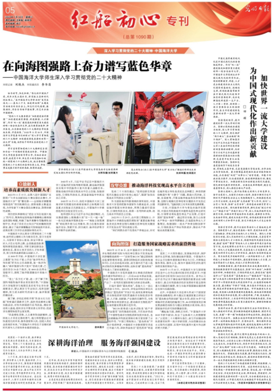 編者按:在中國海洋大學(xué)第十一次黨代會(huì)即將召開之際,1月18日出版的《光明日報(bào)》“紅船初心”專刊以整版篇幅聚焦中國海洋大學(xué)師生深入學(xué)習(xí)貫徹黨的二十大精神的做法和成效,生動(dòng)講述學(xué)校黨委深入學(xué)習(xí)貫徹黨的二十大精神,把全校黨員干部、師生員工的思想和行動(dòng)統(tǒng)一到黨的二十大精神上來,把力量凝聚到黨的二十大確定的各項(xiàng)任務(wù)上來,學(xué)校事業(yè)發(fā)展不斷開創(chuàng)新局面、取得新成績。