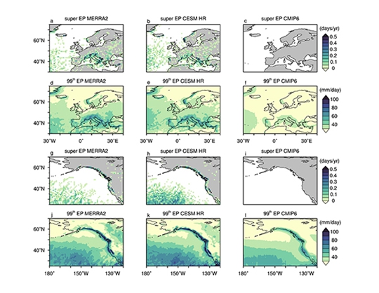 圖1 歷史時(shí)期觀測和模擬的西歐和北美西海岸極端降水天數(shù)和強(qiáng)度。a-c顯示1975-2004年之間基于再分析數(shù)據(jù)MERRA-2數(shù)據(jù)(a)以及模式數(shù)據(jù)CESM-HR(b)和CMIP6(c),西歐超極端降水年均天數(shù)的空間分布。e-f展示的是第99百分位極端降水強(qiáng)度的空間分布。面板g-l與a-f相同,但為北美西海岸的情況。