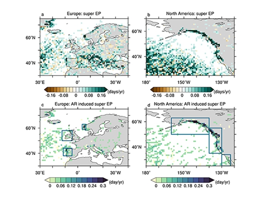 圖2 基于高分辨率模式的未來極端降水和大氣河流引發(fā)極端降水變化預(yù)測。面板a-b顯示了西歐(a)和北美西海岸(b)在2070-2099年期間與歷史時(shí)期相比的超級(jí)極端降水總天數(shù)變化。面板c-d顯示了西歐(c)和北美西海岸(d)在2070-2099年期間,由大氣河流引發(fā)的超級(jí)極端降水天數(shù)相較于歷史時(shí)期(1975-2004)的變化。
