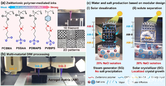 圖1. 本研究中用于多材料墨水直寫的光熱墨水設(shè)計和用于濃鹽水淡化和結(jié)晶的光熱復(fù)合材料的分級結(jié)構(gòu)打印制備。