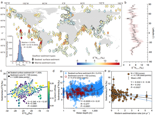 modern marine sediments”(現(xiàn)代海洋沉積物中氮同位素信號(hào)的全球模式與驅(qū)動(dòng)因素)的最新研究成果,系統(tǒng)解析了現(xiàn)代海洋沉積物中氮同位素的時(shí)空演變特征,并指出在百年尺度上人類(lèi)活動(dòng)與氣候變化正以前所未有的強(qiáng)度重塑海洋氮循環(huán)格局。
