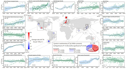 本研究系統(tǒng)整合了全球海洋表層沉積物及近百年沉積巖心的δ15N數(shù)據(jù),并結(jié)合初級(jí)生產(chǎn)力、陸源輸入及沉積環(huán)境等因子,重建過(guò)去百年海洋氮循環(huán)的演變及驅(qū)動(dòng)機(jī)制。研究發(fā)現(xiàn),海洋沉積物δ15N呈現(xiàn)顯著緯向分異和區(qū)域異質(zhì)性,全球尺度上δ15N變化主要反映海洋生態(tài)系統(tǒng)中氮的生物利用及有機(jī)氮生產(chǎn)。多數(shù)巖心中的δ15N持續(xù)升高,這與河流氮輸入增強(qiáng)、初級(jí)生產(chǎn)力提升及反硝化作用加強(qiáng)相關(guān);但在受陸源輸入影響顯著的河口及近海區(qū)域,沉積氮庫(kù)的變化更多地受河流攜帶的低δ15N惰性有機(jī)碳控制,可能掩蓋了海洋中氮生物利用的真實(shí)信號(hào)。