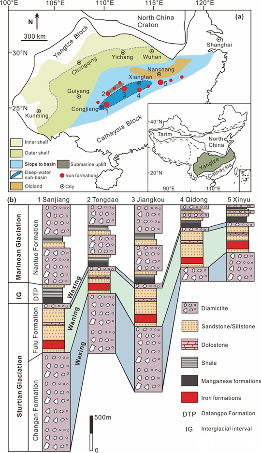本研究選取保存全球完整雪球地球沉積記錄的南華盆地為調(diào)查區(qū)域,對覆蓋斜坡至深水盆地相的五個典型Sturtian冰消期IFs(三江、通道、江口、祁東、新余)(圖1),開展了系統(tǒng)的地質(zhì)與多指標地球化學研究,其中元素和同位素分析包括共生赤鐵礦和磁鐵礦生命必需金屬及稀土元素的含量與分布、鐵和鎳非傳統(tǒng)穩(wěn)定同位素組成、碳酸鹽的全巖與原位碳同位素組成等(圖2、3和4)。