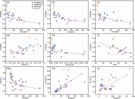 圖3 華南板塊Sturtian 冰消期IFs中磁鐵礦的鎳同位素(δ60Ni)、金屬元素及稀土元素與釔(REY)之間的相關(guān)性