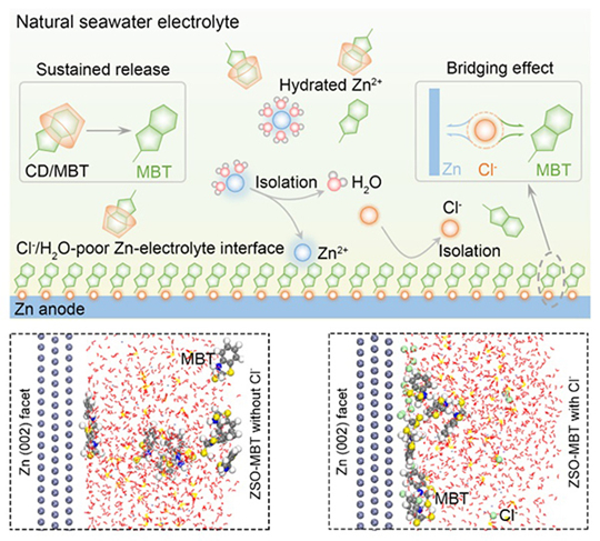 海水鋅離子電池可為海洋監(jiān)測、深海裝備及沿?稍偕茉磧(chǔ)存提供直接、安全的能源供給,在海洋應(yīng)用中具有獨(dú)特優(yōu)勢。然而海水電池中富氯/水的負(fù)極-電解液界面,給鋅金屬負(fù)極帶來嚴(yán)重的腐蝕挑戰(zhàn)。針對(duì)此挑戰(zhàn),研究團(tuán)隊(duì)設(shè)計(jì)了一種含有主客體復(fù)合物添加劑的海水電解液。該電解液以2-巰基苯并噻唑(MBT)作為客體分子,借助環(huán)糊精(CD)主體實(shí)現(xiàn)緩釋控制,有效調(diào)控其在電解液中的含量。氯離子通過橋接效應(yīng)在電極界面構(gòu)筑出致密的MBT屏障,形成貧氯/貧水的局部微環(huán)境,顯著抑制了鋅負(fù)極的腐蝕行為,延長其循環(huán)壽命。實(shí)驗(yàn)表明,鋅負(fù)極在實(shí)際放電深度42.7%的條件下實(shí)現(xiàn)了400小時(shí)以上的穩(wěn)定循環(huán);N/P比為1.92的全電池經(jīng)歷600次循環(huán)后仍保持99%的容量,安時(shí)級(jí)軟包電池初始放電容量達(dá)1.21Ah,并可穩(wěn)定循環(huán)50圈。該研究為發(fā)展低成本、實(shí)用型海水鋅離子電池提供了新思路。相關(guān)論文以“Chloride-Bridged Compact Interfacial Shielding for Practical Seawater Zinc Batteries”(氯橋接致密界面屏蔽實(shí)現(xiàn)實(shí)用型海水鋅電池)為題發(fā)表于《德國應(yīng)用化學(xué)》,并被評(píng)選為“Very Important Paper”,該論文的第一作者是材料科學(xué)與工程學(xué)院2022級(jí)博士生范文杰。