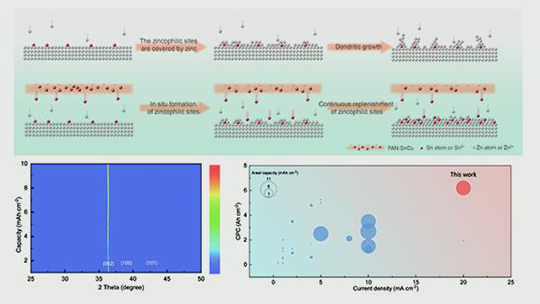 此外,課題組提出了一種動(dòng)態(tài)界面合金化策略,通過可控離子釋放實(shí)現(xiàn)自適應(yīng)界面調(diào)控。該策略采用氯化亞錫和聚丙烯腈靜電紡絲復(fù)合界面膜,逐步釋放亞錫離子并在負(fù)極表面原位還原形成金屬錫。后續(xù)的鋅沉積促使持續(xù)形成鋅-錫合金,不斷補(bǔ)充親鋅位點(diǎn),誘導(dǎo)Zn(002)面外延生長。該合金化界面還可加速亞錫離子在局部缺陷區(qū)域的還原,引導(dǎo)鋅優(yōu)先沉積,修復(fù)結(jié)構(gòu)完整性,從而顯著提升負(fù)極的可逆性與穩(wěn)定性;谠摬呗缘碾姵乜蓪(shí)現(xiàn)3.5 mAh cm-2的面容量,穩(wěn)定循環(huán)超過1000次。相關(guān)研究以“Dynamic Interfacial Alloying for Highly Reversible Zinc Anodes”(動(dòng)態(tài)界面合金化構(gòu)筑高可逆鋅負(fù)極)為題發(fā)表于《先進(jìn)功能材料》,該論文的第一作者是材料科學(xué)與工程學(xué)院2023級(jí)博士生王興杰。