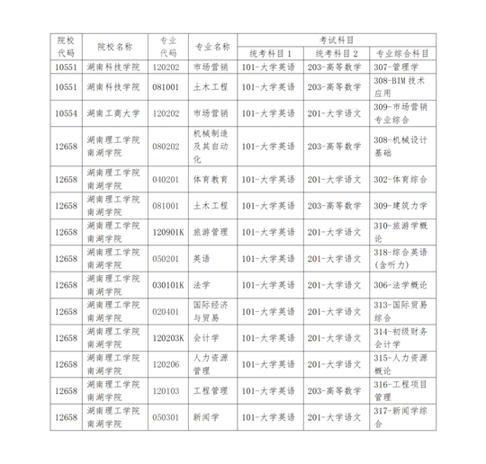 根據(jù)《湖南省教育廳關(guān)于做好2025年湖南省普通高等學(xué)校專升本考試招生工作的通知》(湘教發(fā)〔2024〕54號(hào))要求,現(xiàn)將湖南工商大學(xué)、湖南科技學(xué)院、湖南理工學(xué)院南湖學(xué)院增補(bǔ)2025年普通高校專升本考試招生專業(yè)及考試科目的情況公告如下: