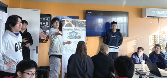 之后,參訪隊(duì)伍來到位于教學(xué)樓四樓的創(chuàng)新領(lǐng)導(dǎo)力中心——“RoboVigor”機(jī)器人賽隊(duì)活動(dòng)室。國際生們受到賽隊(duì)成員與指導(dǎo)老師的熱情接待。一進(jìn)門,同學(xué)們便被眼前豐富的器材與設(shè)備所震撼。負(fù)責(zé)項(xiàng)目管理的陳淇同學(xué)首先為同學(xué)們介紹了賽隊(duì)概況:賽隊(duì)分為四個(gè)小組,機(jī)械組負(fù)責(zé)機(jī)械設(shè)計(jì)、制造與調(diào)試;算法組負(fù)責(zé)編程、算法優(yōu)化與人工智能;電控組負(fù)責(zé)電子電路設(shè)計(jì)、電機(jī)驅(qū)動(dòng)與控制;而他所在的運(yùn)營組則負(fù)責(zé)團(tuán)隊(duì)財(cái)務(wù)管理、活動(dòng)策劃與宣傳推廣等工作。