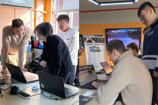 介紹完畢,陳淇引導(dǎo)同學(xué)們來到活動(dòng)室中央,一場別開生面的機(jī)器人互動(dòng)體驗(yàn)隨即展開。國際生們興致勃勃地拿起遙控器,親身體驗(yàn)操控RoboVigor自主研發(fā)的機(jī)器人。隊(duì)長周瓊為同學(xué)們簡明精要地介紹了機(jī)器人的設(shè)計(jì)與原理,其精妙的結(jié)構(gòu)與靈活的表現(xiàn)令大家贊嘆連連。緊接著,電控組組員劉睿哲介紹了賽隊(duì)參與的各項(xiàng)賽事及比賽規(guī)則,并圍繞實(shí)戰(zhàn)經(jīng)驗(yàn)與備賽策略,與國際生們展開了熱烈交流。而在另一邊,機(jī)械組組長畢宗洋邀請(qǐng)同學(xué)們坐到電腦前,體驗(yàn)機(jī)器人競賽全真模擬軟件,國際生們化身機(jī)器人操縱師,在模擬場地中大顯身手。