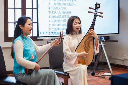 最后,在互動(dòng)環(huán)節(jié),兩位嘉賓選取了一些評(píng)彈演奏中的常用語(yǔ),如“你”“我”“他”等,逐字逐句地教大家發(fā)音,現(xiàn)場(chǎng)黨員積極跟隨學(xué)習(xí),氣氛十分熱烈。她們帶領(lǐng)現(xiàn)場(chǎng)黨員學(xué)唱評(píng)彈《鶯鶯拜月》的片段和蘊(yùn)含江南韻味的歌曲《聲聲慢》,吳儂軟語(yǔ)搭配清雅的三弦、琵琶伴奏,展現(xiàn)了傳統(tǒng)樂(lè)曲的韻味,活動(dòng)在《聲聲慢》的動(dòng)人合唱中結(jié)束。