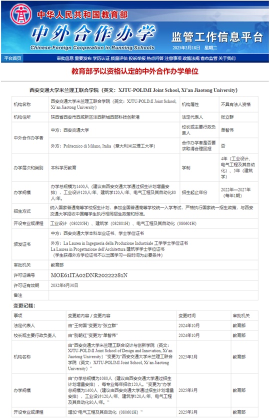 近日,教育部中外合作辦學監(jiān)管工作信息平臺更新西安交通大學米蘭理工聯(lián)合學院公示信息,學院增加電氣工程及其自動化(080601H)專業(yè),批準每年招生80人。