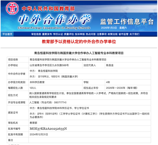 近日,教育部公布中外合作辦學項目審批結果,青島恒星科技學院與韓國京畿大學合作舉辦的人工智能專業(yè)本科教育項目成功獲批。這是青島恒星科技學院首個獲教育部批準的中外合作辦學項目,標志著學校在引進優(yōu)質國際教育資源、推進人才培養(yǎng)國際化方面邁出了重要一步。
