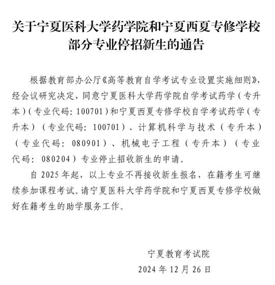 | 關(guān)于寧夏醫(yī)科大學(xué)藥學(xué)院和寧夏西夏專修學(xué)校部分專業(yè)停招新生的通告 |