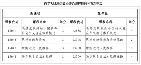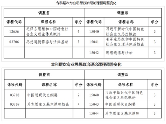 調(diào)整后,我省自學(xué)考試?、本科層次各專業(yè)思想政治理論課均設(shè)置3門課程,共9學(xué)分。調(diào)整變化如表所示: