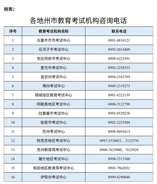 請(qǐng)隨時(shí)關(guān)注新疆教育考試院官方網(wǎng)站和“新疆招生”微信公眾號(hào)發(fā)布的相關(guān)信息。報(bào)名期間如遇疑問,請(qǐng)致電報(bào)名報(bào)考屬地教育考試機(jī)構(gòu)咨詢(咨詢電話號(hào)碼見附表2)。