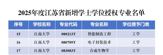 ,江南大學(xué)智能制造工程、電子封裝技術(shù)和合成生物學(xué)3個(gè)專業(yè)成功新增為學(xué)士學(xué)位授權(quán)專業(yè)。