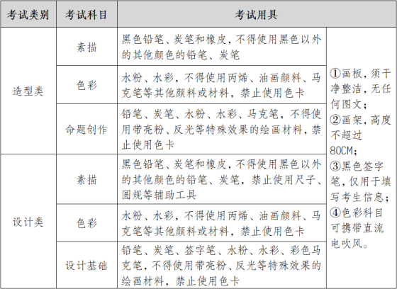 ①鉛筆、炭筆、簽字筆、水粉、水彩、彩色馬克筆,不得使用帶亮粉、反光等特殊效果的繪畫材料,禁止使用色卡;