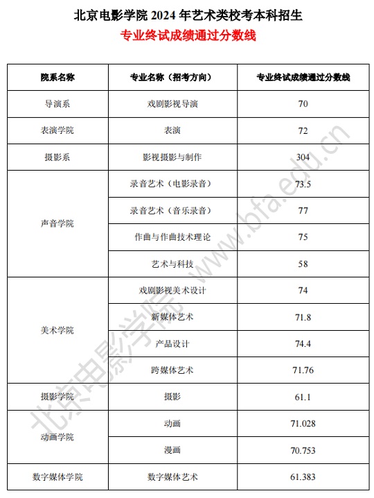 北京電影學(xué)院2024年藝術(shù)類?急究普猩鷮I(yè)終試成績通過分?jǐn)?shù)線