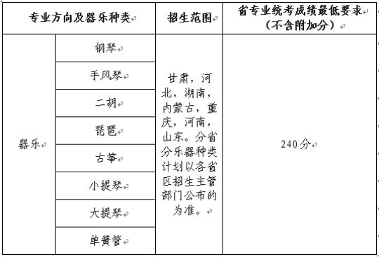 專業(yè)考試器樂種類須與我校招生專業(yè)對應(yīng)的器樂種類完全匹配,否則不予錄取。無影響器樂演奏的生理缺陷?忌陨砩硇慕】禒顩r不影響專業(yè)表演、演奏和學(xué)習(xí),符合《普通高等學(xué)校招生體檢工作指導(dǎo)意見》及有關(guān)補(bǔ)充規(guī)定要求。