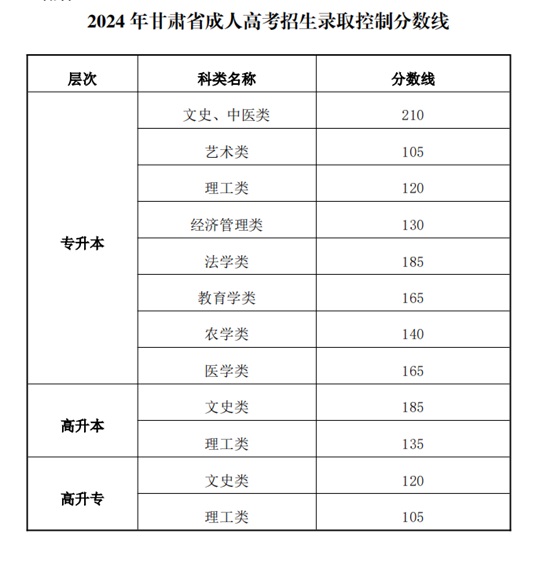 2024年甘肅省成人高考招生錄取控制分?jǐn)?shù)線