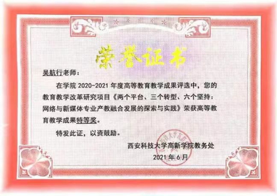 本項(xiàng)目主持人為新傳媒與藝術(shù)學(xué)院常務(wù)副院長吳航行副教授。吳航行副教授在網(wǎng)絡(luò)與新媒體專業(yè)領(lǐng)域深耕多年,公開發(fā)表學(xué)術(shù)論文近40篇,主持各級(jí)各類科研項(xiàng)目10余項(xiàng),主編出版新媒體專業(yè)相關(guān)教材7部,連續(xù)兩年榮獲陜西本科高校教師教學(xué)創(chuàng)新大賽三等獎(jiǎng),連續(xù)三年榮獲西安科技大學(xué)高新學(xué)院優(yōu)秀管理干部,先后六年榮獲西安科技大學(xué)高新學(xué)院優(yōu)秀教師榮譽(yù)稱號(hào)。中國煤炭教育協(xié)會(huì)教學(xué)成果獎(jiǎng)二等獎(jiǎng)主持人,校級(jí)教學(xué)成果獎(jiǎng)特等獎(jiǎng)主持人,《影視鑒賞》一流課程主持人,影視攝影與制作專業(yè)帶頭人,西安科技大學(xué)高新學(xué)院教學(xué)督導(dǎo),蘭州財(cái)經(jīng)大學(xué)新聞與傳播專業(yè)碩士研究生導(dǎo)師,西安交通大學(xué)新聞與新媒體學(xué)院訪問學(xué)者。近年來,研究方向聚焦于網(wǎng)絡(luò)與新媒體、影視文化傳播、文化產(chǎn)業(yè)管理,指導(dǎo)學(xué)生多次獲得省級(jí)、國家級(jí)學(xué)科競賽獎(jiǎng)項(xiàng)多項(xiàng)。