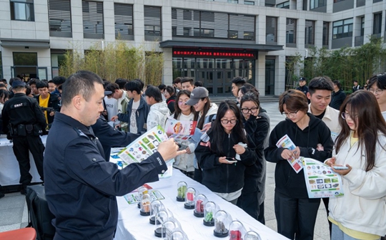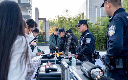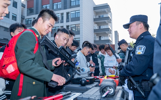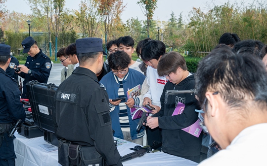活動過程中,專業(yè)的特警人員首先為同學們講解了禁毒相關(guān)知識,并耐心地解答現(xiàn)場同學們所提出的疑問;同時現(xiàn)場設有特警裝備展示,可以讓同學們近距離的互動體驗,全方位提高安全防范意識。