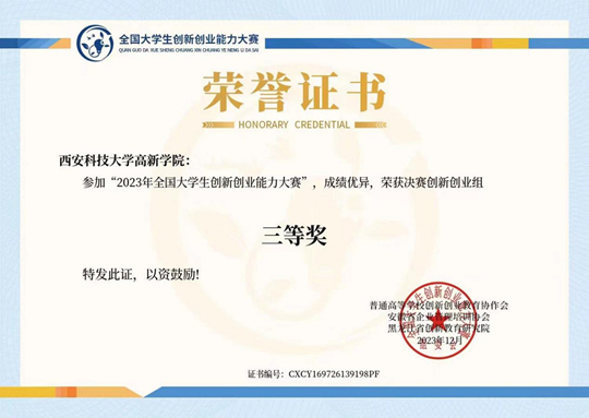 | 西安科技大學(xué)高新學(xué)院學(xué)子獲得2023全國(guó)大學(xué)生創(chuàng)新創(chuàng)業(yè)能力大賽全國(guó)三等獎(jiǎng)! |